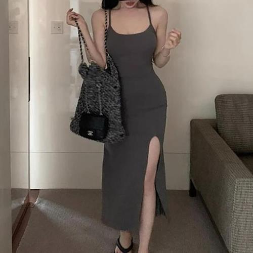 [다잇템]여성 편한 슬리브리스 슬림핏 롱 언발 원피스 (33482514A)