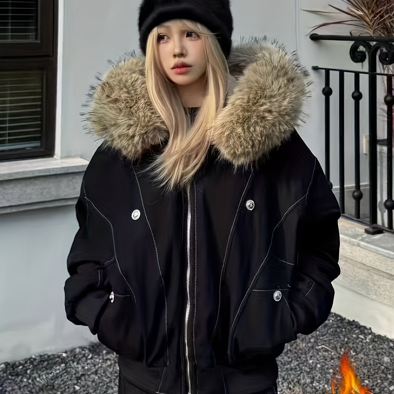 TEMU 겨울 한국 스타일 풀 집업 후드 여성 재킷 | 빅 칼라, 루즈핏, 단색, 레귤러 소매, 밑단 디테일의 빈티지 두꺼운 코트