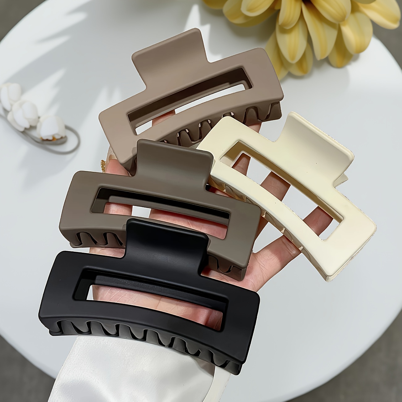 TEMU 4개 세트 미끄럼 방지 직사각형 헤어 클립 - 스타일 홀로우 디자인, 4가지 색상 (화이트, 카키, 브라운, 블랙), 내구성 있는 고품질 헤어 액세서리, 트렌디한 애호가를 위한 필수품, 대형 헤어 클립, 여성용 헤어 후크, 모던 헤어 도구, 스퀘어 헤어 클로, 여성용 헤어 브로치, 헤어 클로, 헤어 후크