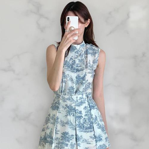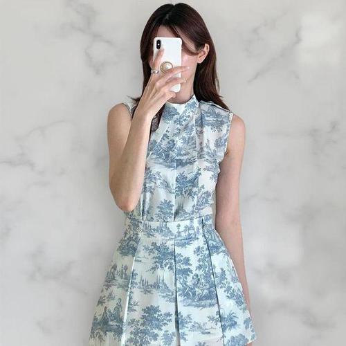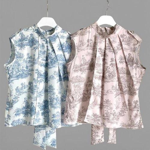 [신상오픈런]여성 빈티지 프린트 핀턱 반목 민소매 블라우스