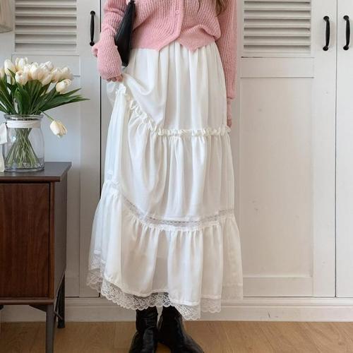 [다잇템]여자 고무줄 새틴 귀여운 프릴 레이스 롱스커트 (14362744A)