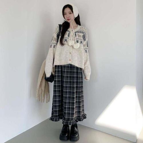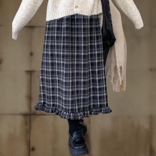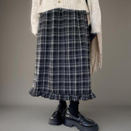 [신상오픈런]여성 체크무늬 프릴 롱 스커트 플레어 디자인
