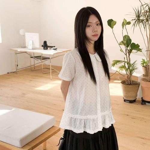[시크블랙]로래느 오버핏 도트 카라 프릴 블라우스