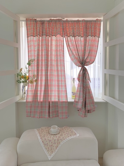 MorningSea 예쁜 심플 자가드 방진 커튼 이층 정원풍 체리 장식 거실 침실 프릴커튼