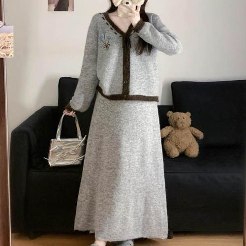 비지트인뉴욕 기모 플라워 자수 맨투맨 앤 롱 스커트 투피스 (V5CST02)