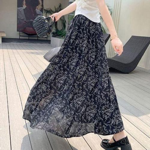 QEWBG 여성 플라워 패턴 A라인 주름 롱 스커트 데일리용