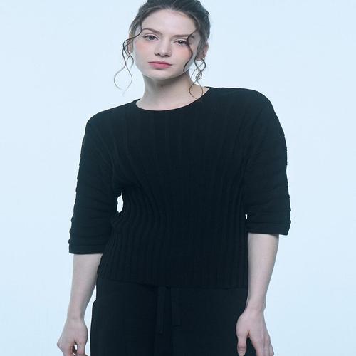 [유닛]실크 블렌디드 플리츠 크루넥 풀오버 (UFKKCN11CN-BLACK)