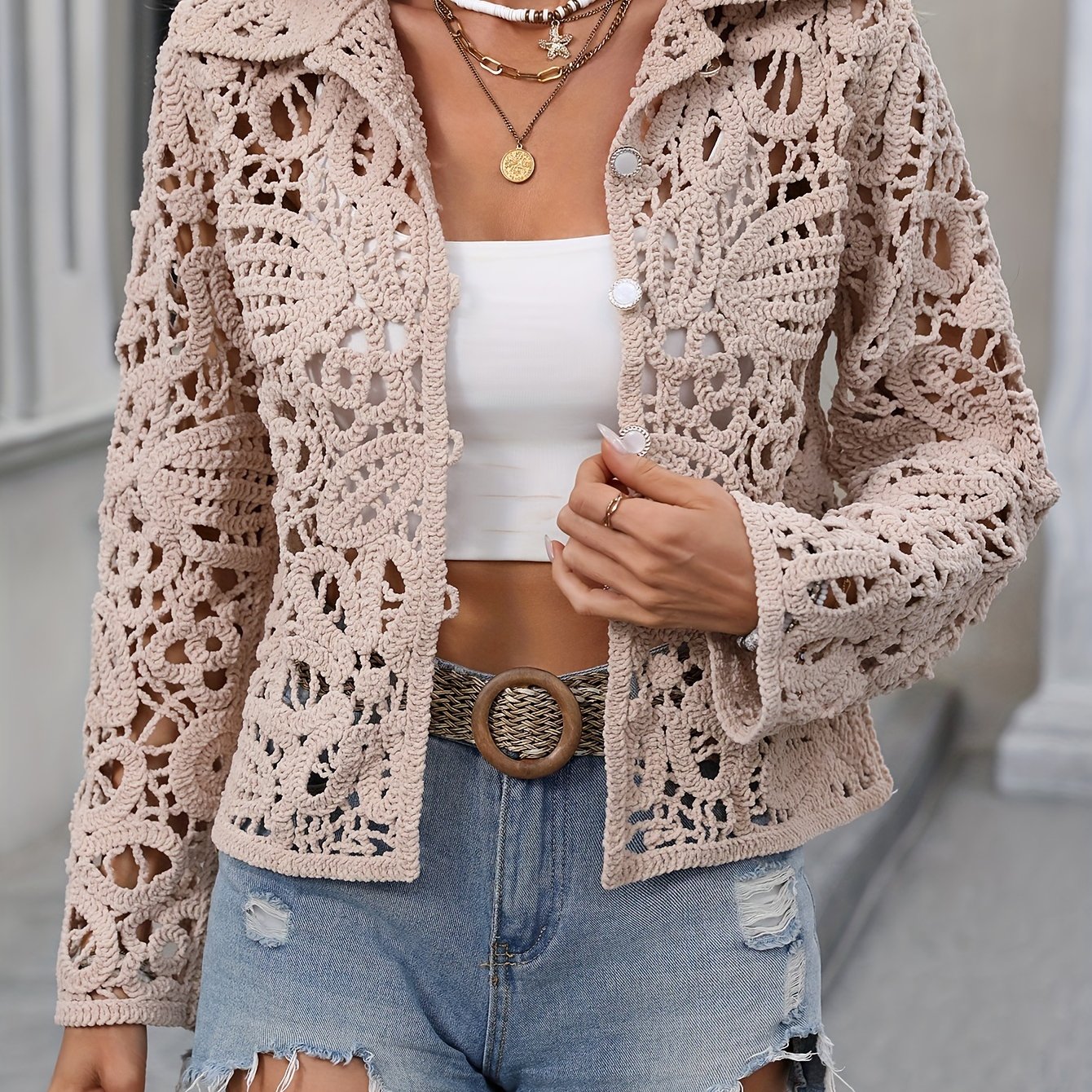TEMU 여성용 시크 레이스 가디건 - 캐주얼 롱 슬리브, 버튼업 턴다운 칼라, 반투명 폴리에스터 혼방, 사계절용