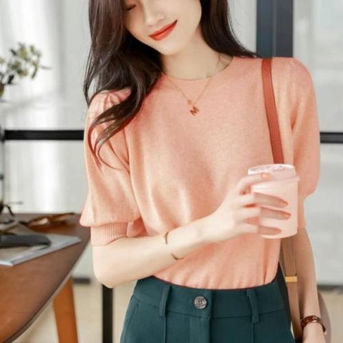 [옷자락]여자 산뜻 색상 SS 반소매 옐로우 피치 미니멀리즘 니트