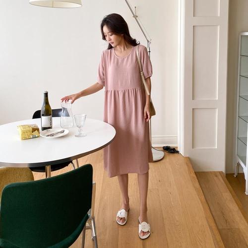 [옷자락] 여성 심플 핀턱 셔링 라운드넥 미디 반팔 원피스