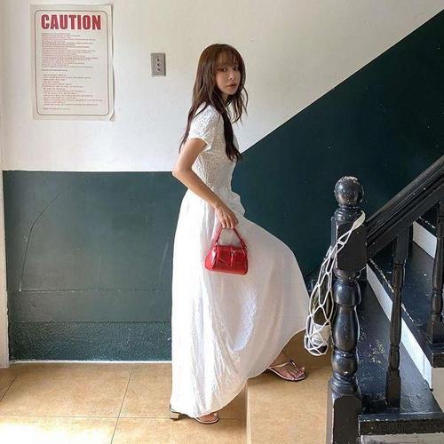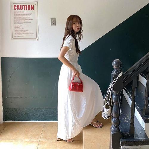 [옷자락] 여성 엠보 반팔 핀턱 셔링 플레어 롱 원피스