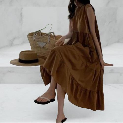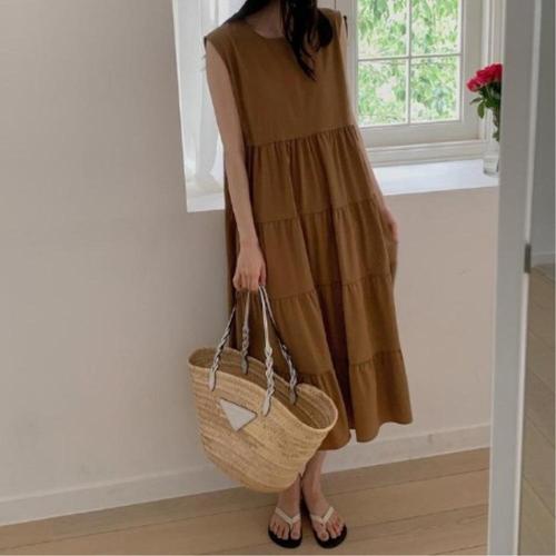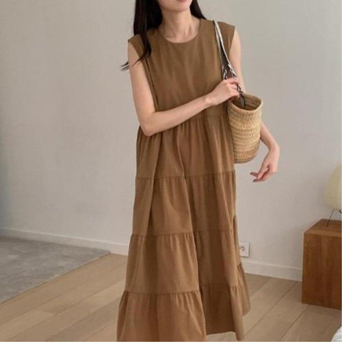 |CHO5614|여성용 린넨 핀턱 셔링 민소매 롱 드레스