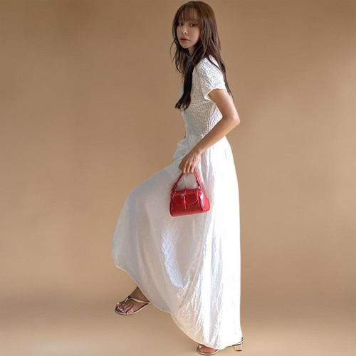 |CHO56E6|여성 핀턱 셔링 롱 원피스 엠보 반팔 플레어 드레스