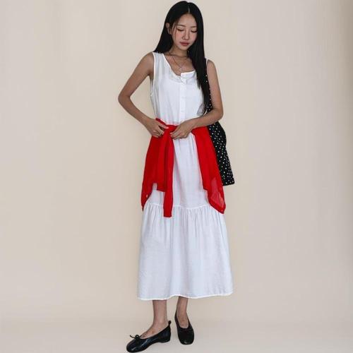 |CMO5691|여성 단색 버튼 핀턱 셔링 민소매 롱 드레스