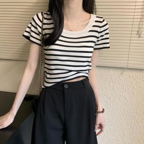 [다잇템]여자 슬림핏 SS 클래식 단가라 반소매 니트 (14649887A)