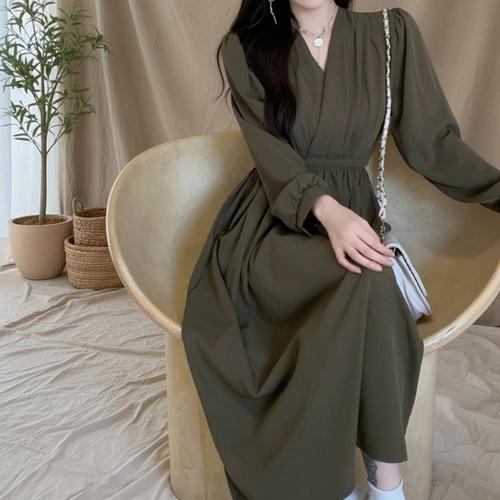 블레스유 여성 봄 가을 벨트 프렌치 카라 롱 핀턱 랩 원피스 하객룩 데이트룩 데일리룩 허리조절 긴팔 브이넥