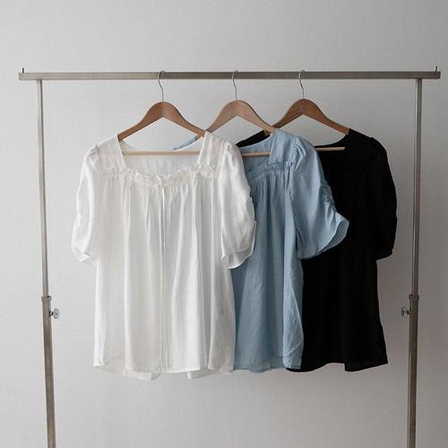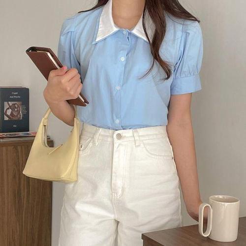 [셀러허브_여성트랜드패션]여자 반소매 흰블라우스 하늘색 블라우스