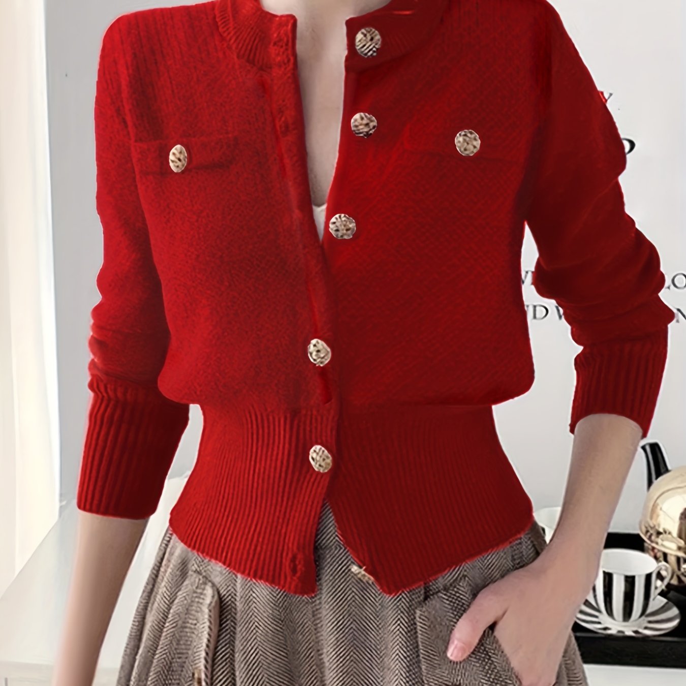 TEMU 여성용 레드 케이블 카디건 스웨터 - 반팔 라운드넥 버튼 프론트, 미디엄 스트레치 기계 세탁 가능 봄/가을 레이어링 필수품, 소녀를 위한 스웨터 카디건, 우아한 니트웨어, 내구성 있는 원단