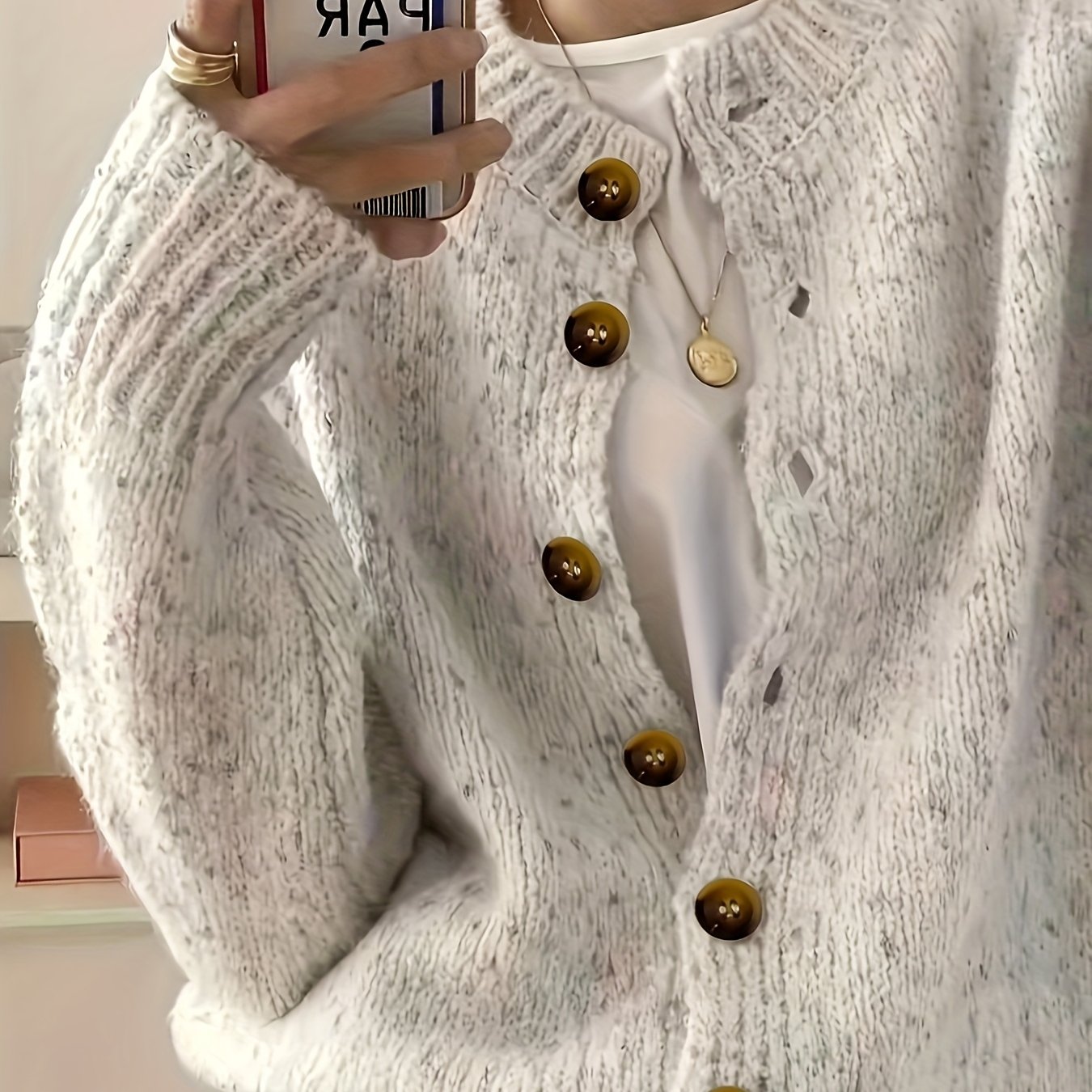 TEMU 여성용 우아한 화이트 프렌치 가디건 - 골드톤 버튼, 부드러운 루즈핏 긴팔 라운드넥 겨울코트, 고급스러운 텍스처와 중간 수준의 신축성, 캐주얼과 포멀웨어에 활용 가능한 1색상 이너 & 외피 레이어링, Front Button Closure로 완성된 사계절형 니트웨어, 사무실복으로 적합