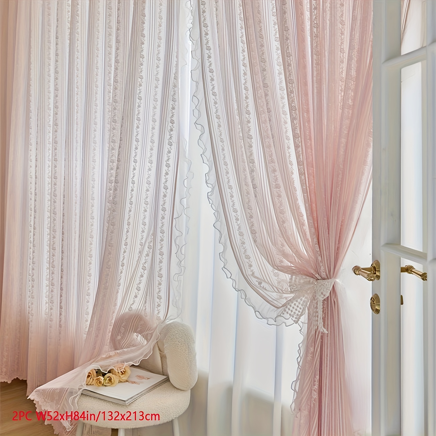 TEMU Aifish 핑크 레이스 투명 커튼 - 루플 디테일, 더블 레이어 비즈 틸 투명 스트랩, 침실 및 거실용 로맨틱 폴리에스터 원단, 우아한 홈 데코, 거실용 커튼