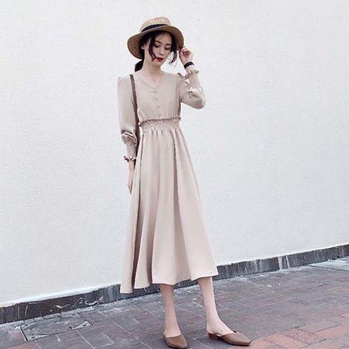 [다잇템]여자 허리밴드 롱슬리브 Y넥 스모킹 버튼 잔주름 롱원피스