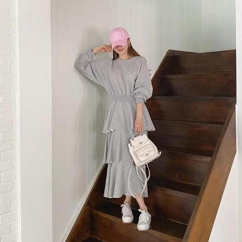 [VY] 여자 맨투맨 FW 캉캉 U넥 허리밴드 롱원피스
