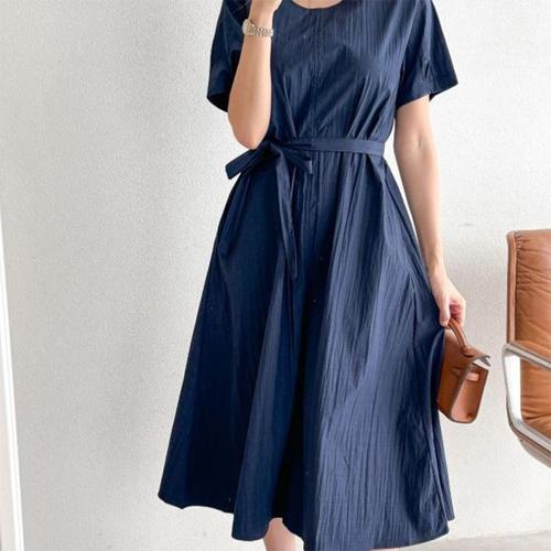 여성 시원한 시어서커 브이넥 허리벨트 반팔 미디 원피스 CL-WOP0327