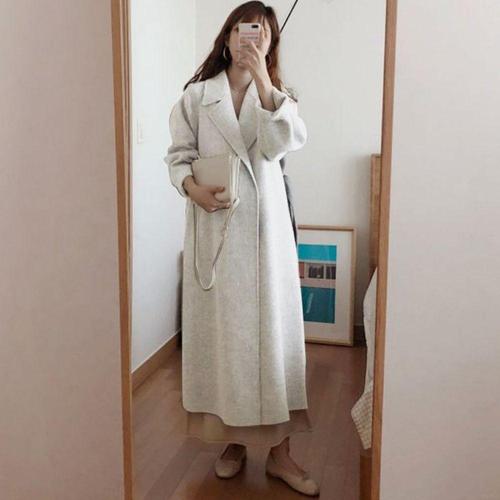 세련된코트 허리벨트 모직코트 단추없는 코트 미디기장 랩st 여성코트