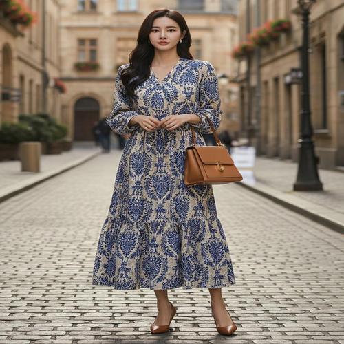 |CDO562D|여성 에스닉 패턴 허리스트링 반팔 롱 원피스