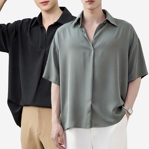 [아이에스이랩]오버핏 반오픈 헨리넥 반팔 카라 셔츠 3컬러 I2SH019