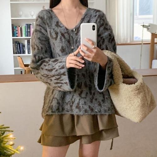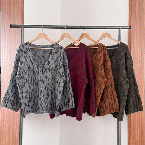 여성 딥브이넥 헤어리 호피 박스핏 퍼니트 니트