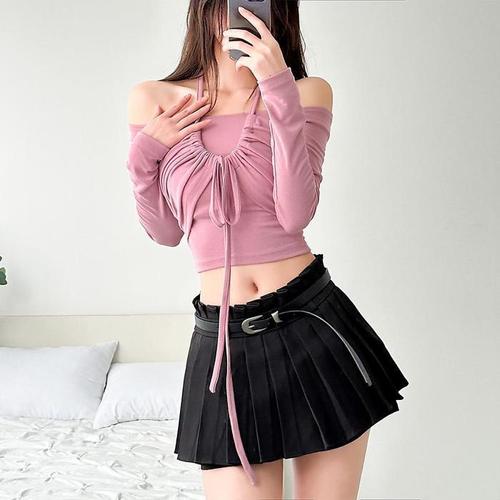 여자 홀터 SS 끈 잔주름 홀복 티셔츠