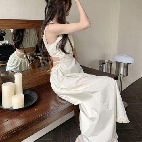 [옷자락] 여자 백리스 홀터넥 리본스트랩 바캉스룩 롱 원피스