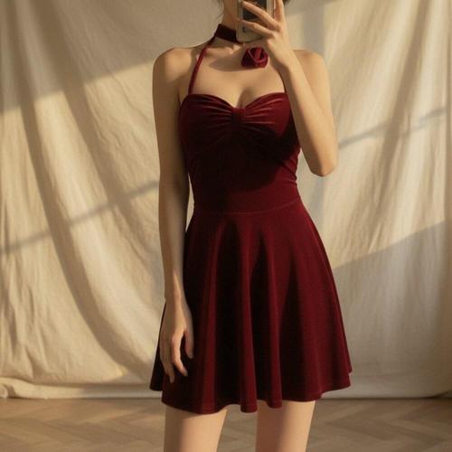 [옷자락]여성 벨벳 홀터넥 슬림 미니 플레어 원피스