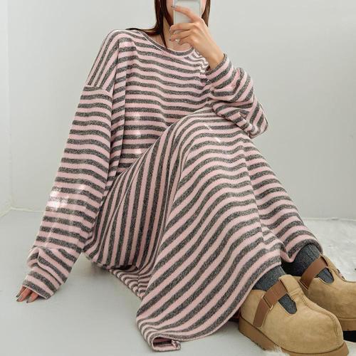 여자 겨울홈웨어 줄무늬 큰사이즈 롱원피스