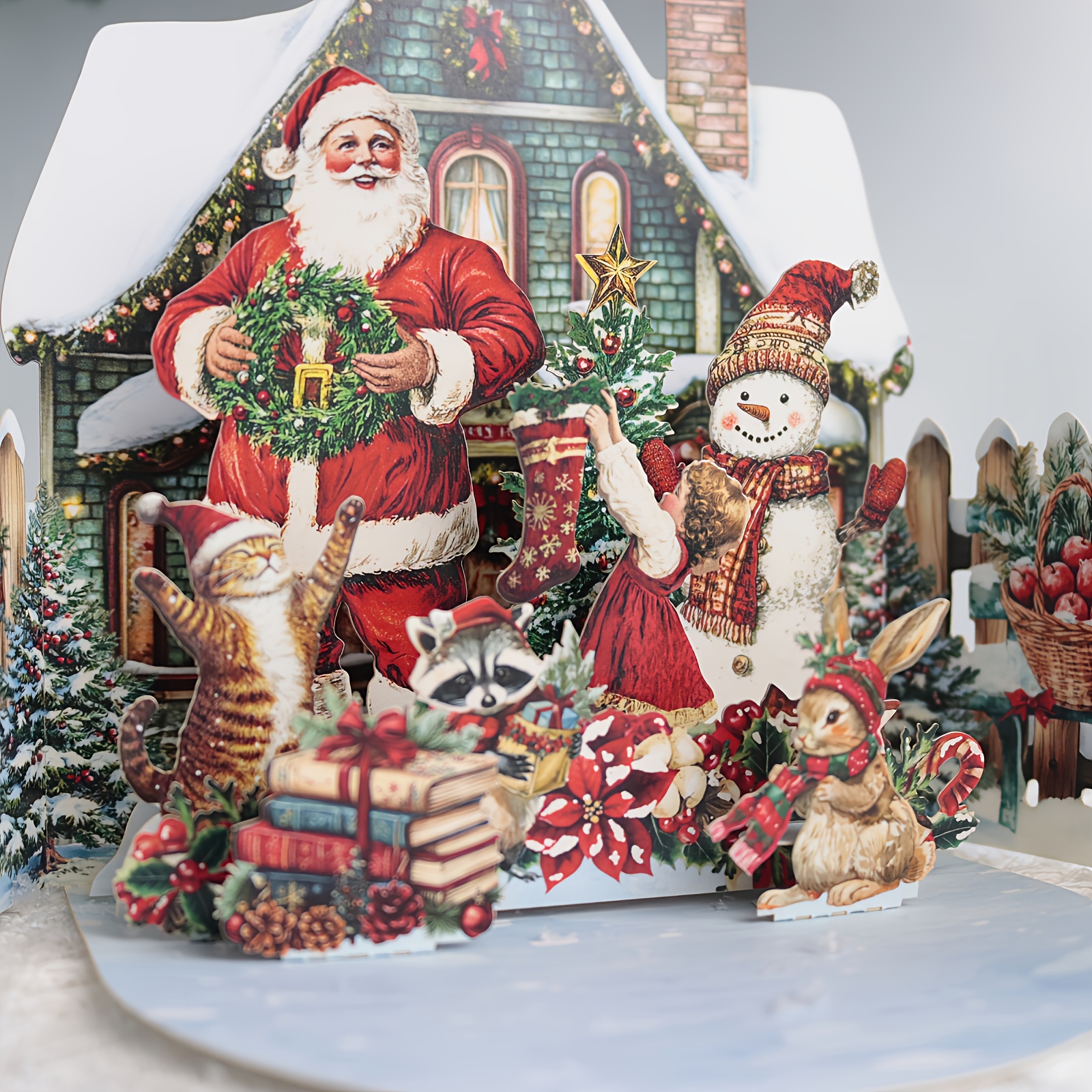 TEMU 1개 초대형 팝업 크리스마스 카드 - 사면, 눈이 내린 집, 선물들, 고양이, 토끼, 눈사람과 함께하는 기계식 메커니즘 (전기 불필요), 우아한 접이식 종이 파티 초대장 & 인사말 카드 + 봉투 포함, 문으로 배달용 3D 홈/오피스/트리 디스플레이를 위한 상호작용적인 겨울의 신비로운 풍경