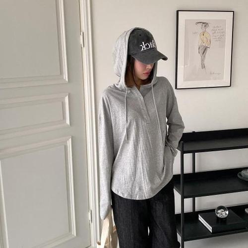[신상오픈런]|KHT483D|예데리 회색 티셔츠 비대칭 단추 오버핏 여성 롱슬리브_18174527_597559