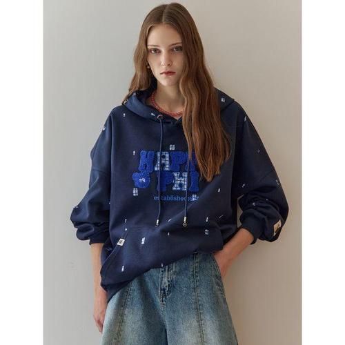 [마쟈]체크 믹스 부클 레터링 루즈핏 후드 티셔츠
