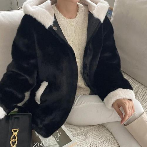 캐주얼 여성 오버핏 페이크 밍크퍼 후드 집업 자켓점퍼 잠바 겨울 가디건 청자켓 리스 레트로 패딩 숏패딩