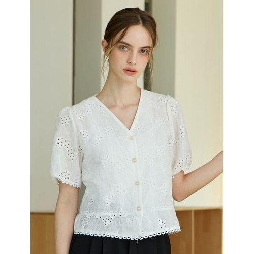 [나인식스뉴욕]펀칭 브이넥 반팔 블라우스 (NQ2BA006L0)