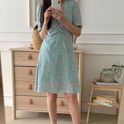 [다잇템]여자 반소매 휴양지룩 V넥 잔주름 미니원피스 (15304437A)