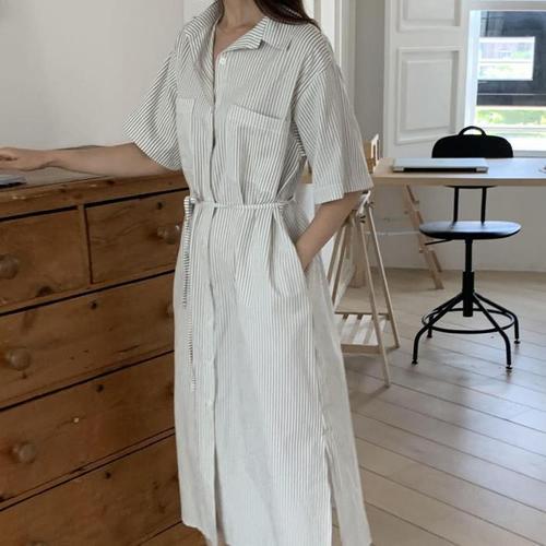 [다잇템]여자 트임 더블포켓 휴양지룩 남방 롱원피스 (15882305A)