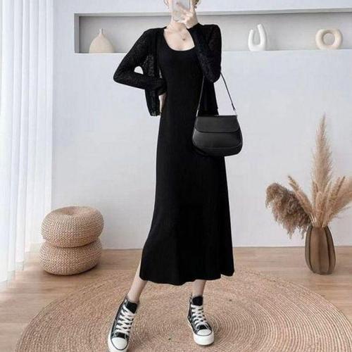 [에이치플러스몰]여름 시원한 스판 반팔 롱원피스 블랙 휴양지룩 편한