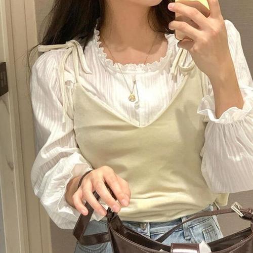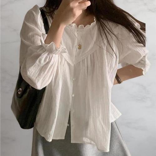 [다잇템]여성 롱슬리브 레이스 흰색 프릴 블라우스 (41040800A)
