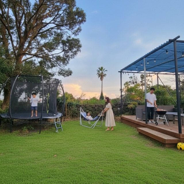귤밭뷰 감성돌집, 대형 트램폴린, 50평의 잔디마당 야외 바베큐, 미니축구와 놀이