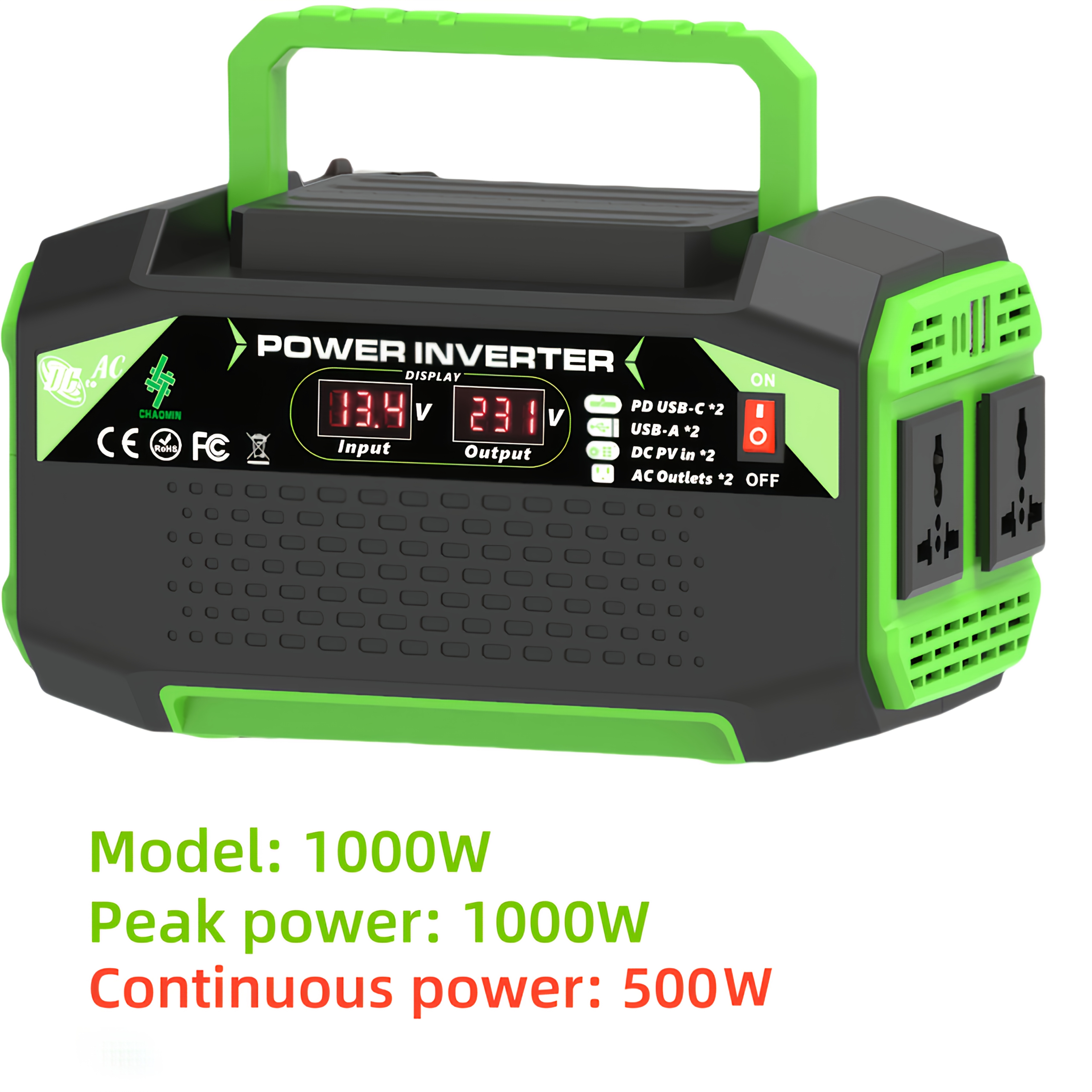 TEMU 휴대용 파워 인버터 1000W/500W, DC 12V에서 AC 220V/230V 전압 변환기, 듀얼 USB+더블 C-타입+더블 유니버설 소켓, LCD 스마트 디스플레이, 액세서리 수납실, 손쉬운 휴대, 자동차, 트럭, 밴, 야외 여행에 적합|USB|USB