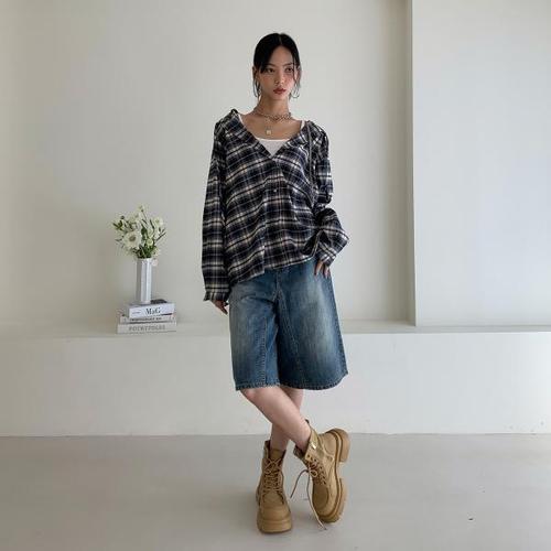[옷자락] 여자 스트릿패션 스티치 와이드핏 버뮤다 5부 데님