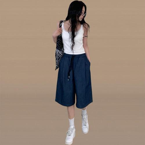 [신상오픈런]여성용 핀턱 와이드 데님 5부 팬츠 밴딩 버뮤다 스타일