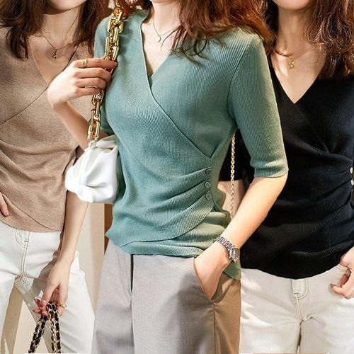 여성 브이넥 여름 외출 패션 깔끔한 7부 블라우스