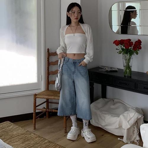 여성 난스판 구제 데미지 8부 와이드 데님팬츠 크롭 통청바지